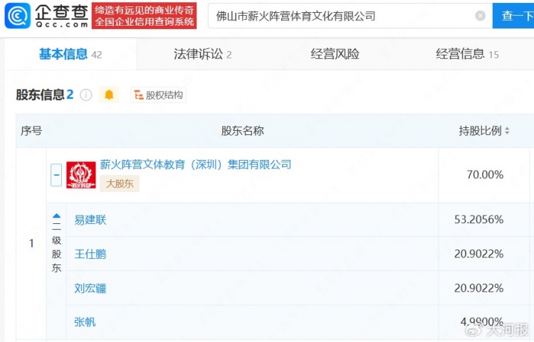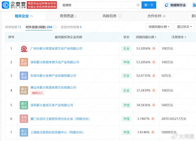 企查查APP顯示,易建聯(lián)關(guān)聯(lián)15家企業(yè),其中12家為存續(xù)狀態(tài),包括薪火陣營文體教育(深圳)集團(tuán)有限公司、上海壹球成名信息技術(shù)有限公司等。此外,易建聯(lián)間接持股企業(yè)超200家,行業(yè)涉及除體育文化外,還包括商貿(mào)、科技、投資等領(lǐng)域。今年2月,易建聯(lián)關(guān)聯(lián)企業(yè)佛山市薪火陣營體育文化有限公司成被執(zhí)行人,執(zhí)行標(biāo)的約12萬元。