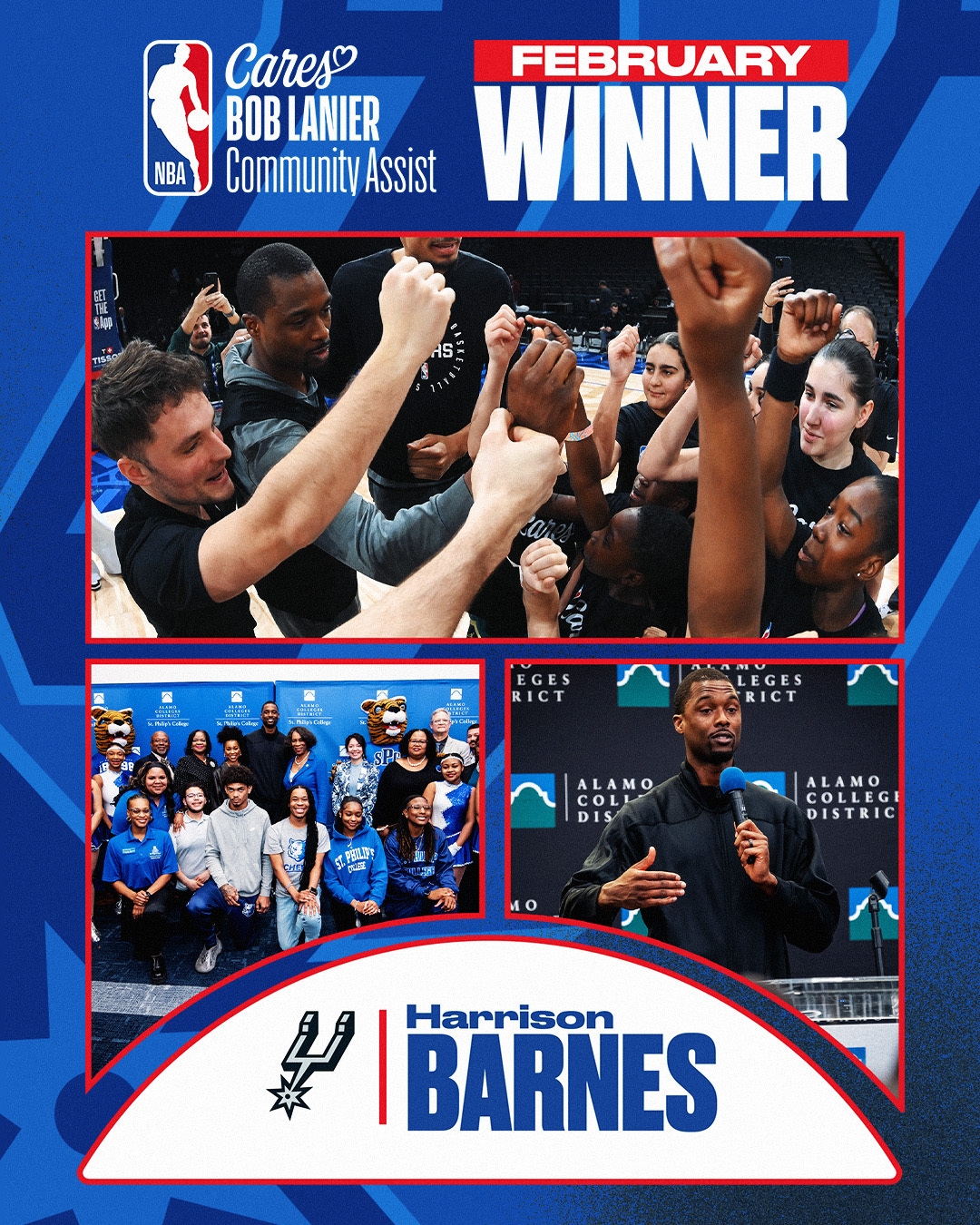 圣安東尼奧馬刺隊(duì)前鋒哈里森-巴恩斯被評為2月份的NBA“鮑勃-蘭尼爾”社區(qū)關(guān)懷援助獎(jiǎng)(Bob Lanier Community Assist Award)得主。巴恩斯和他的妻子布列塔尼向阿拉莫承諾項(xiàng)目(AlamoPROMISE)捐贈(zèng)了25萬美元,該項(xiàng)目為符合條件的貝薩縣學(xué)生支付學(xué)費(fèi)和雜費(fèi)。
