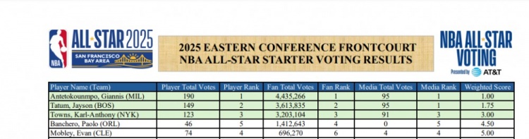 1月24日訊 今天,NBA官方公布了2025年全明星的最終選票詳情。