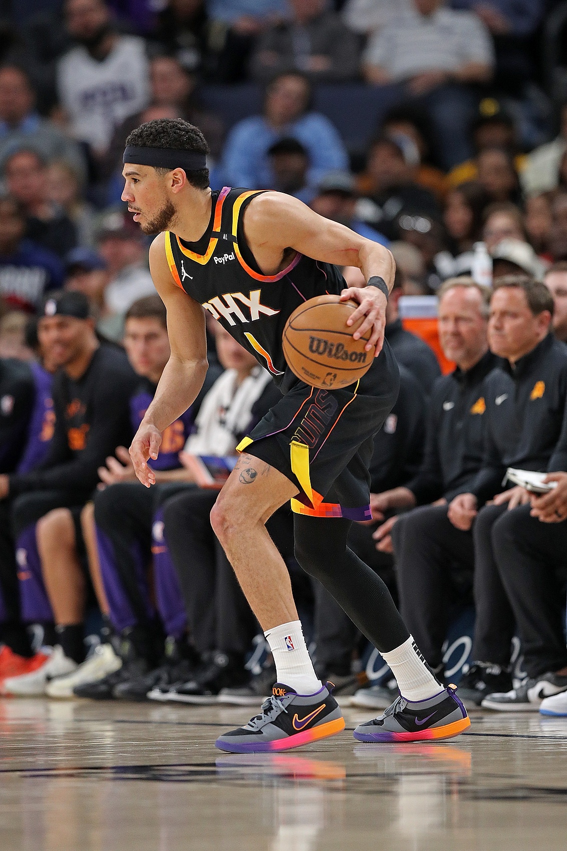 理查茲、比爾、普拉姆利、阿倫四位主要輪換球員缺陣,太陽首發(fā)擺杜蘭特+布克+鄧恩+伊戈達羅+吉萊斯皮,雖然缺兵少將,但圍繞杜蘭特和布克高位擋拆打阿倫依然成功搶到了開局的先手。