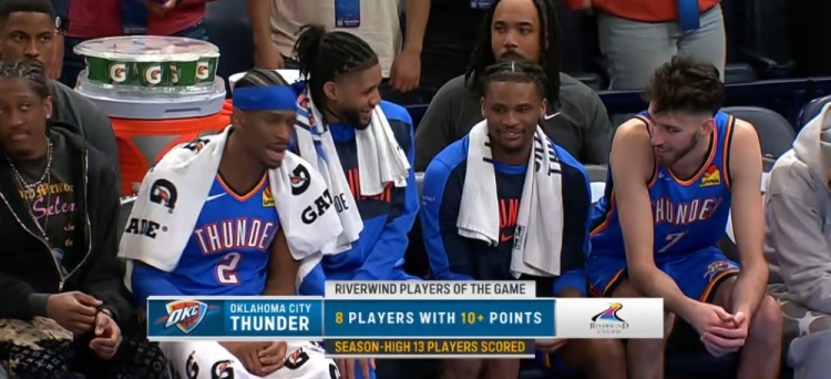 本場比賽雷霆全員發(fā)揮,全隊(duì)共有13個(gè)人有得分入賬,創(chuàng)本賽季新高,其中更是有8人得分上雙!