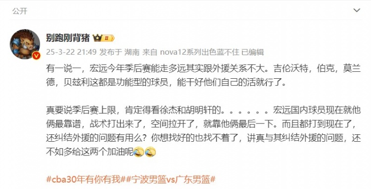 @別跑剛背豬 在個人微博上寫道:“有一說一,宏遠今年季后賽能走多遠其實跟外援關系不大。吉倫沃特,伯克,莫蘭德,貝玆利這都是功能型的球員,能干好他們自己的活就行了。