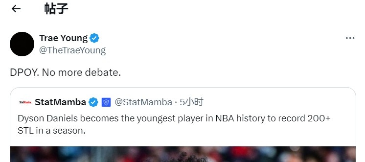 比賽結(jié)束后,老鷹球星特雷-楊轉(zhuǎn)發(fā)了丹尼爾斯的這一數(shù)據(jù),并在旁邊寫道:“年度最佳防守球員。停止?fàn)幷??!?/p>