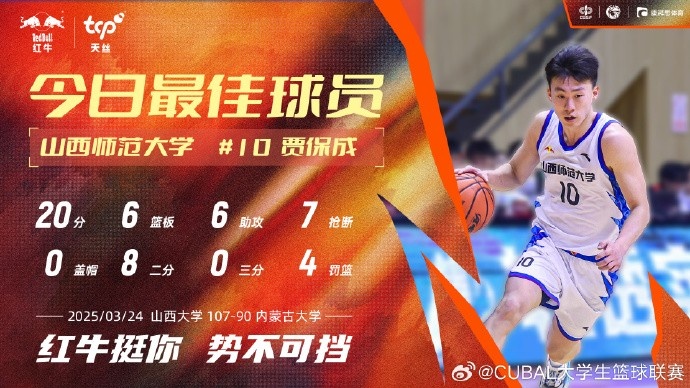 20分6板6助7斷!CUBAL西北賽區(qū)今日最佳球員:山西師范大學(xué)賈保成