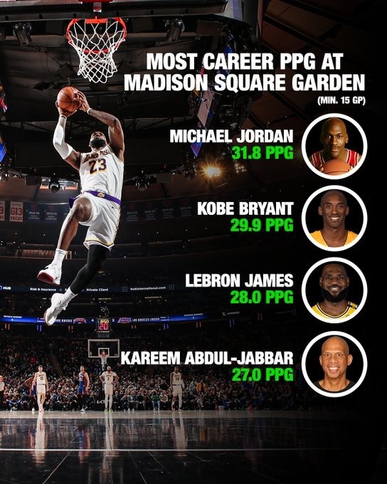 - 麥迪遜廣場花園生涯得分:喬丹31.8分居首 科比2詹姆斯3賈巴爾4