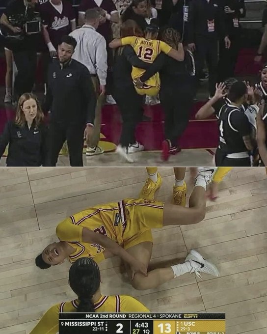 比賽中,南加州大學王牌朱朱-沃特金斯右膝疑似重傷,被攙扶離場。