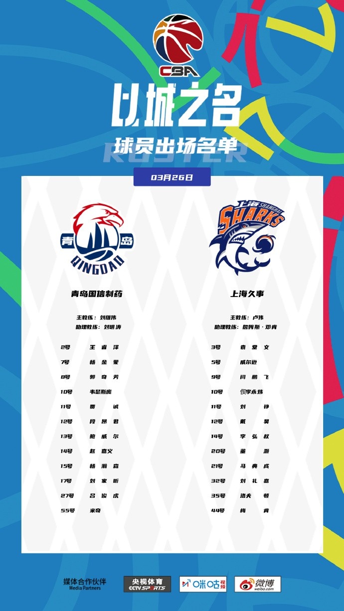 3月26日訊 今晚7點35分,青島男籃將在主場迎戰(zhàn)上海男籃。