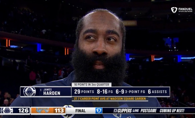 此役過后,哈登生涯在麥迪遜廣場花園比賽的場均得分來到27.7分。