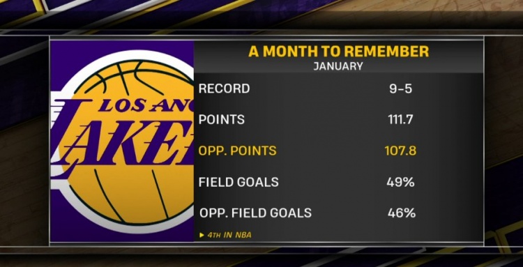 賽前轉(zhuǎn)播方分享了一組數(shù)據(jù):湖人在一月份戰(zhàn)績?yōu)?勝5負(fù),場均得到111.7分,失分107.8分(聯(lián)盟第四少),投籃命中率49%,對(duì)手投籃命中率46%。