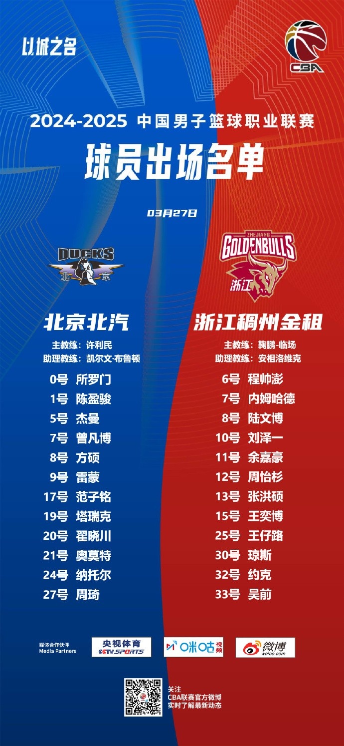 3月27日訊 今晚7點(diǎn)35分,北京男籃將在主場迎戰(zhàn)浙江男籃。