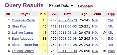 據(jù)統(tǒng)計,希羅(25歲67天)成為熱火隊史單場砍下至少35分且投籃命中率75%+最年輕的球員。榜單其余球員如下: