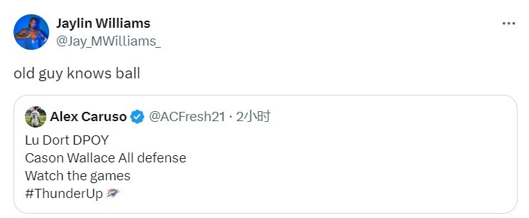 比賽結(jié)束后,卡魯索在社媒上為隊(duì)友多特和華萊士發(fā)聲,他在個(gè)人推特上寫道:“多特DPOY,華萊士最佳防守陣容?!?/p>