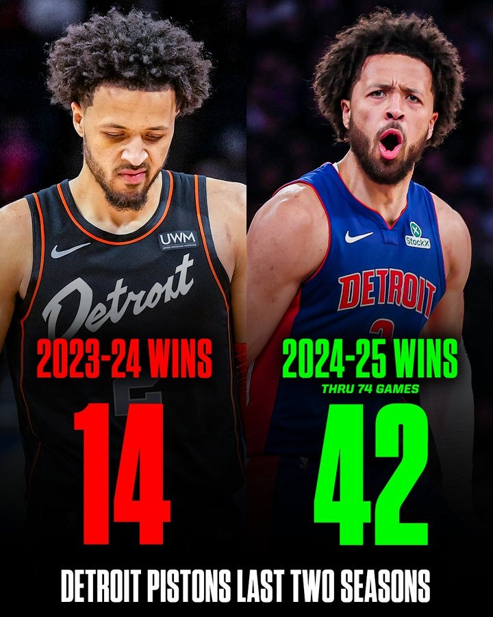 據(jù)統(tǒng)計(jì),活塞上賽季只有14勝,本賽季至今已經(jīng)42勝。他們也成為NBA歷史上第一支贏球場數(shù)是上賽季3倍的球隊(duì)!