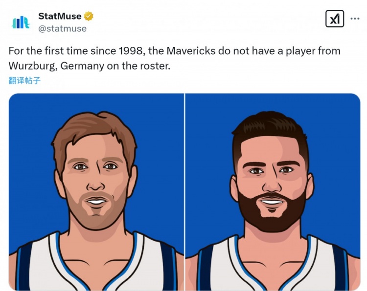 美媒StatMuse:“這是1998年以來,獨行俠首次隊里沒有一名來自德國維爾茲堡的球員。(諾維茨基和克萊伯均來自此地)”