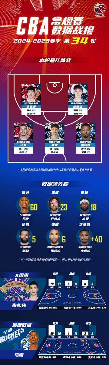 數(shù)據(jù)領(lǐng)先者方面:寧波富邦男籃俱樂部球員馬奇以單場(chǎng)60分的數(shù)據(jù)領(lǐng)銜得分榜;
