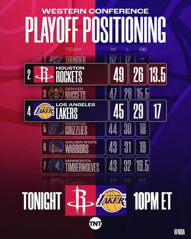 目前火箭49勝26負(fù)西部第二,湖人45勝29負(fù)西部第四。