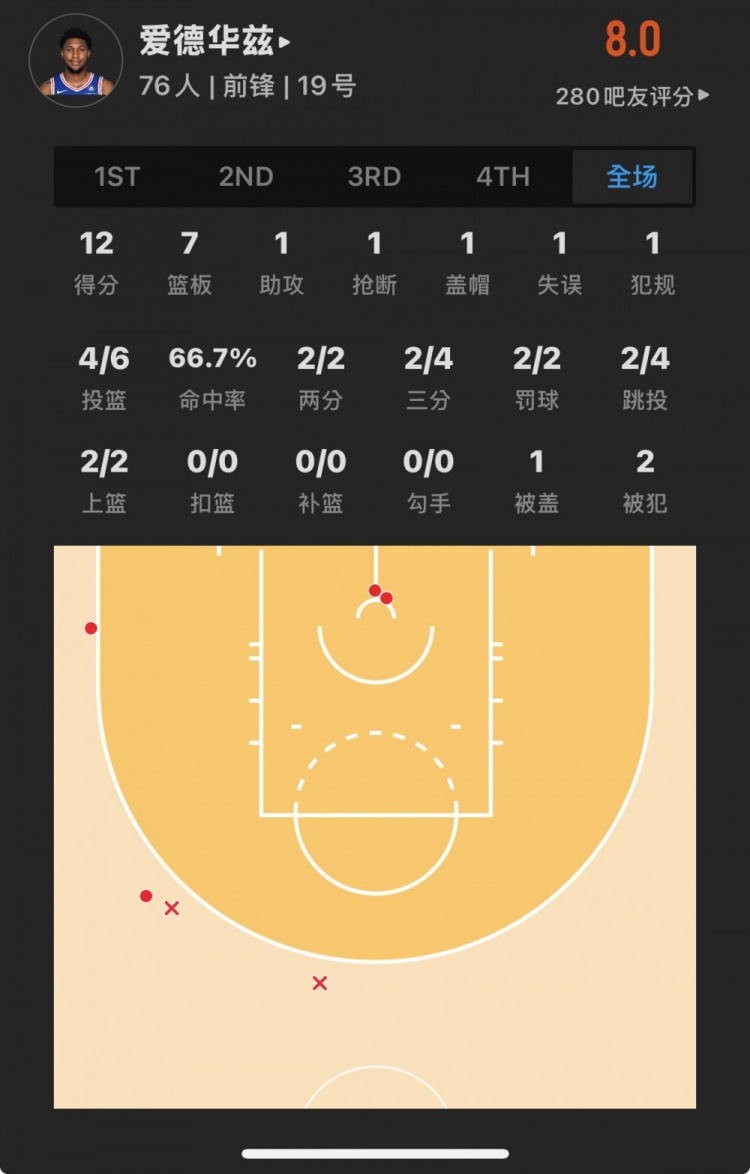 76人41號(hào)秀 阿德姆-博納 登場(chǎng)12.5分鐘