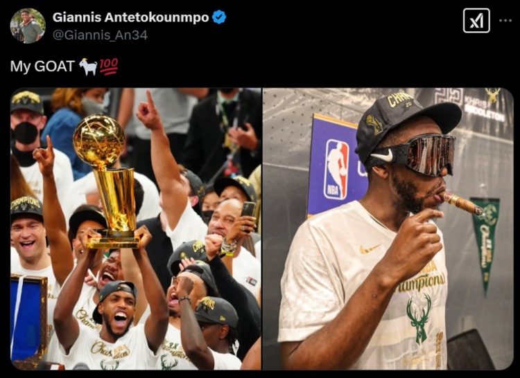 隨后,雄鹿球星揚(yáng)尼斯-阿德托昆博在社交媒體發(fā)布動態(tài),曬出了老隊(duì)友米德爾頓奪冠后的照片(如下圖所示),并配文道:“我的GOAT ????????”