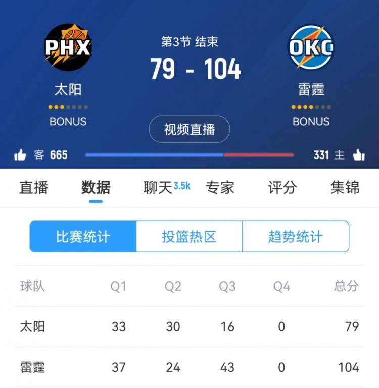 第三節(jié),雷霆攻防兩端壓制對手,單節(jié)43-16凈勝太陽27分,三節(jié)打完雷霆領先25分。