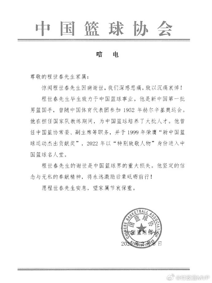 中國籃協(xié)前任副主席、原北京市體委副主任、新中國第一代國手程世春因病逝世,中國籃協(xié)向程世春協(xié)家屬發(fā)唁電慰問。