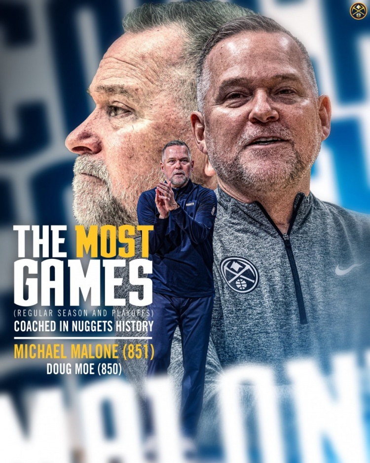 今天掘金官方更推顯示,主帥邁克-馬龍執(zhí)教場(chǎng)數(shù)來到了851場(chǎng)(常規(guī)賽+季后賽),超越道格-莫(850場(chǎng))升至掘金隊(duì)史第一。