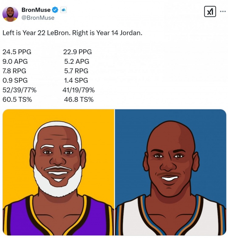 詹姆斯生涯第22季場(chǎng)均24.5分7.8籃板9助攻0.9搶斷,三項(xiàng)命中率52/39/77%,真實(shí)命中率60.5%;