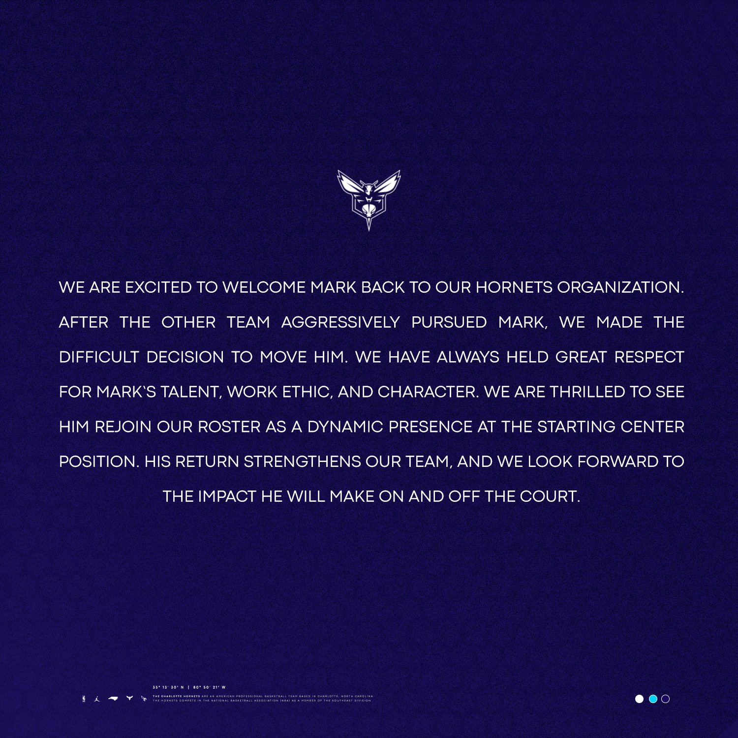 黃蜂官方寫到:“我們很高興的歡迎馬威回到我們的球隊。在另一支球隊積極追求馬威后,我們做出了艱難的決定,將他送走。我們一直非??粗伛R威的才華、職業(yè)態(tài)度和品格。我們很高興看到他回歸繼續(xù)擔(dān)任首發(fā)中鋒,他的回歸增強了我們的球隊,我們期待他在球場內(nèi)外的影響力?!?/p>