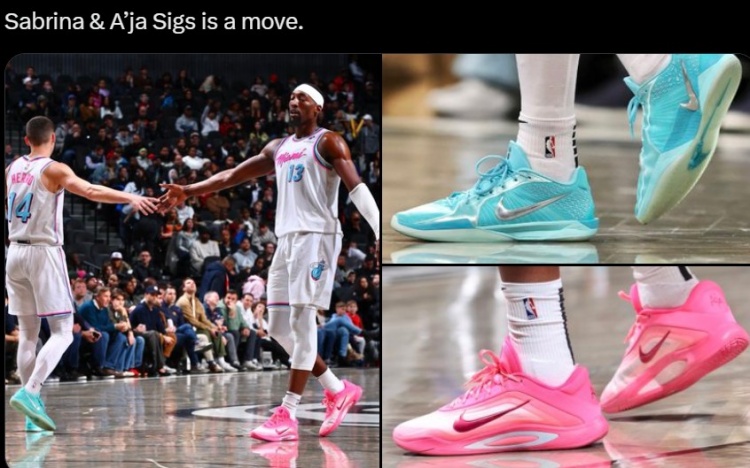 圖片中,阿德巴約上腳了其女友,WNBA王牌的中鋒阿賈-威爾遜的簽名球鞋。而阿賈也來(lái)現(xiàn)場(chǎng)觀戰(zhàn)了熱火的比賽。