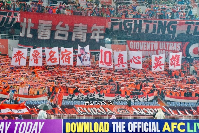 在今晚山東泰山主場對陣光州FC的比賽中,山東球迷打出標語歡迎宿茂臻回歸:“齊魯名宿,真心英雄”。