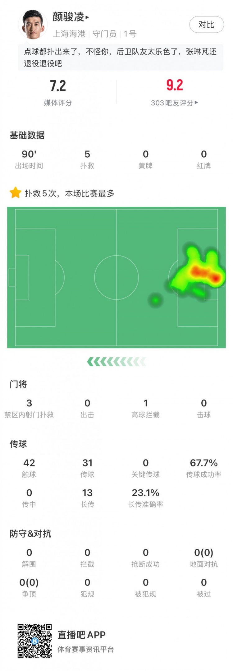 盡力局!顏駿凌撲點(diǎn)&全場(chǎng)5次撲救,賽后評(píng)分7.2隊(duì)內(nèi)最高