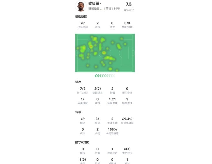 技術統(tǒng)計數據顯示,登貝萊本場比賽7射兩正,3次過人兩次成功,3次錯失重大機會。另外,登貝萊有兩次關鍵傳球,兩次長傳全部成功。