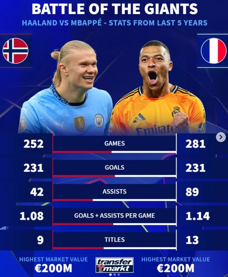 哈蘭德近5年252場231球42助+9冠,姆巴佩同期281場231球89助+13冠