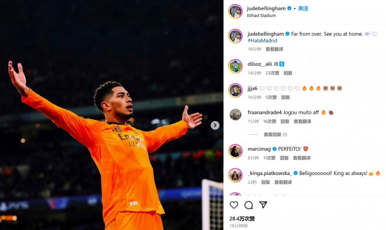 貝林厄姆也在賽后通過社媒曬出自己經(jīng)典的張臂慶祝照,并配文:“一切遠(yuǎn)未結(jié)束。我們主場再見。馬德里前進(jìn)!”
