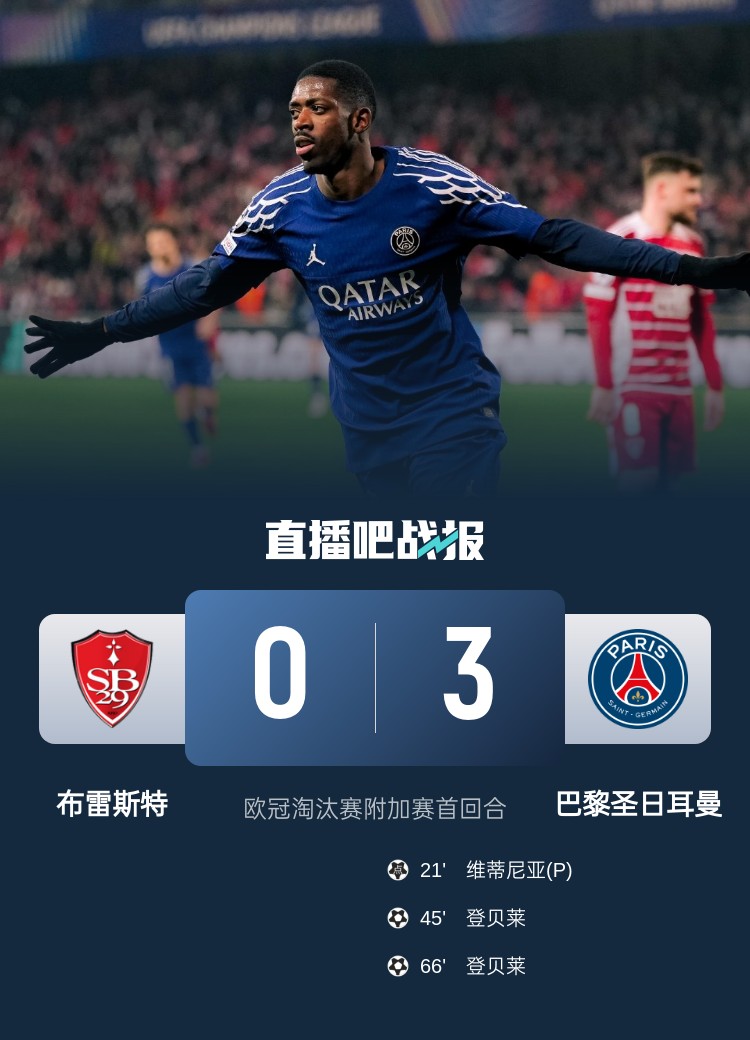 登貝萊梅開(kāi)二度+造點(diǎn),巴黎3-0布雷斯特取得先機(jī)。