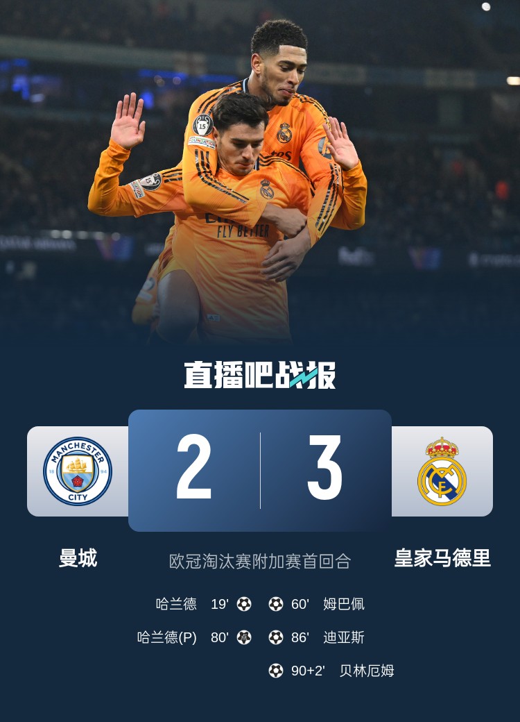 哈蘭德雙響,貝林厄姆絕殺,皇馬3-2曼城,占據(jù)先機(jī)。