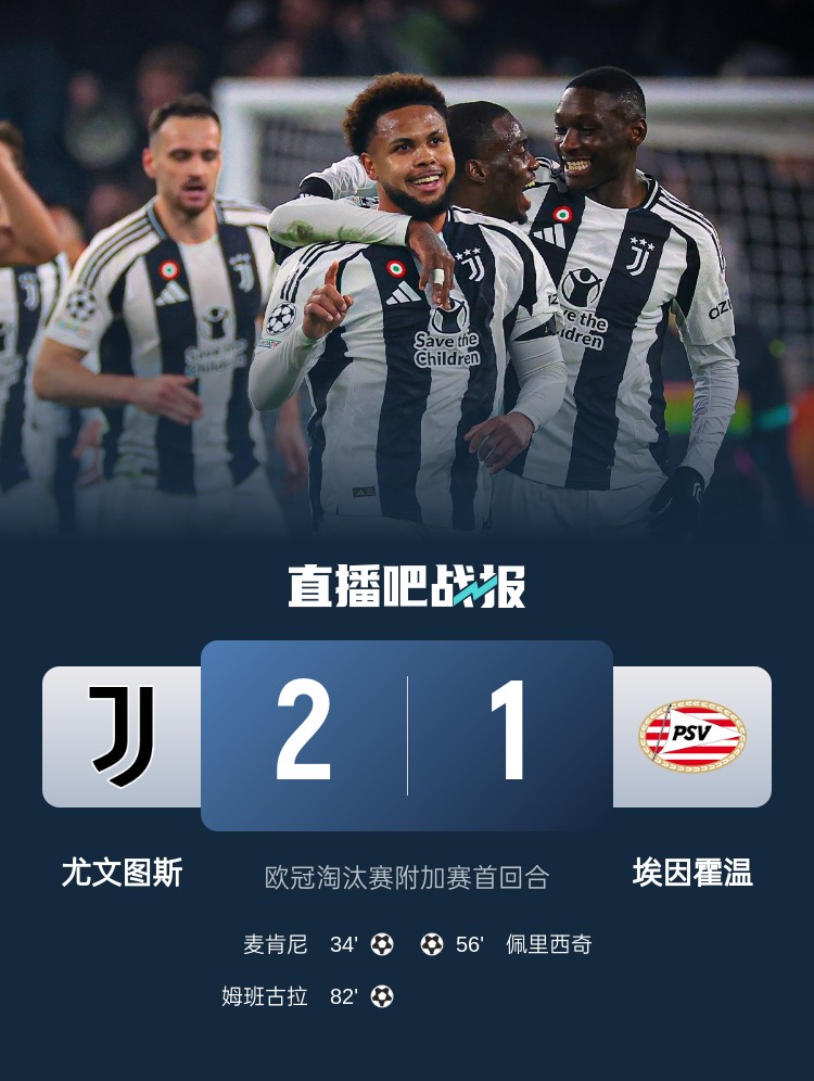 姆班古拉替補(bǔ)制勝,尤文2-1埃因霍溫,雙方次回合將于2月20日移師埃因霍溫主場(chǎng)菲利普球場(chǎng)進(jìn)行。