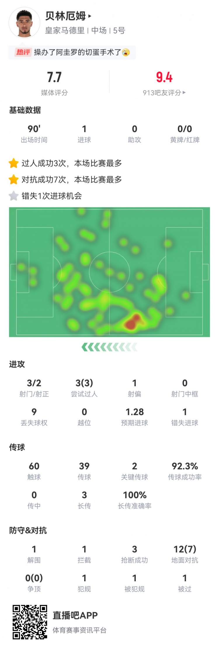 叕絕殺!貝林?jǐn)?shù)據(jù):2射正1進(jìn)球,2關(guān)鍵傳球,1錯(cuò)失進(jìn)球,評分7.7