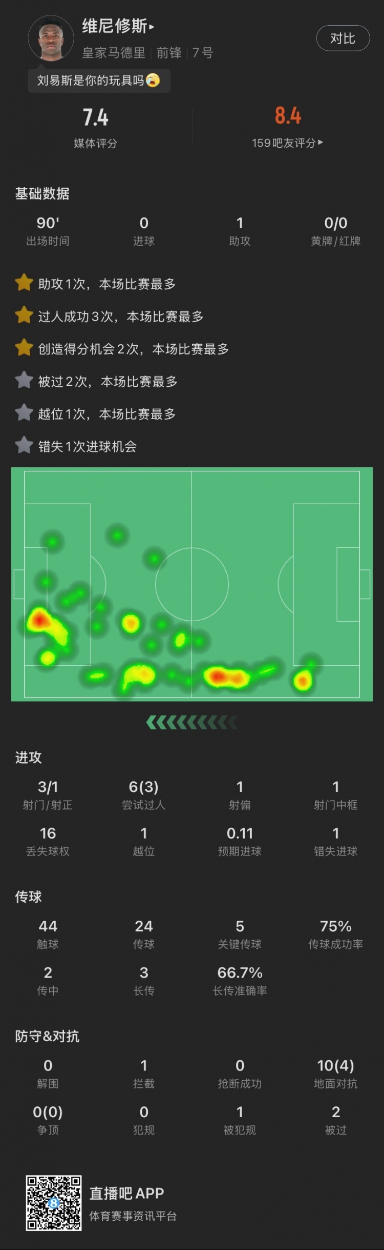 不受橫幅影響!維尼修斯本場:助攻絕殺,5次關鍵傳球,3過人成功