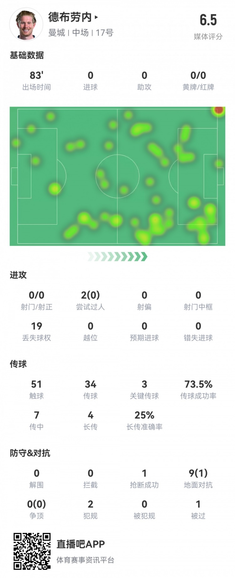 德布勞內(nèi)數(shù)據(jù):0射0正,3次關(guān)鍵傳球,19次丟失球權(quán),評分僅6.5
