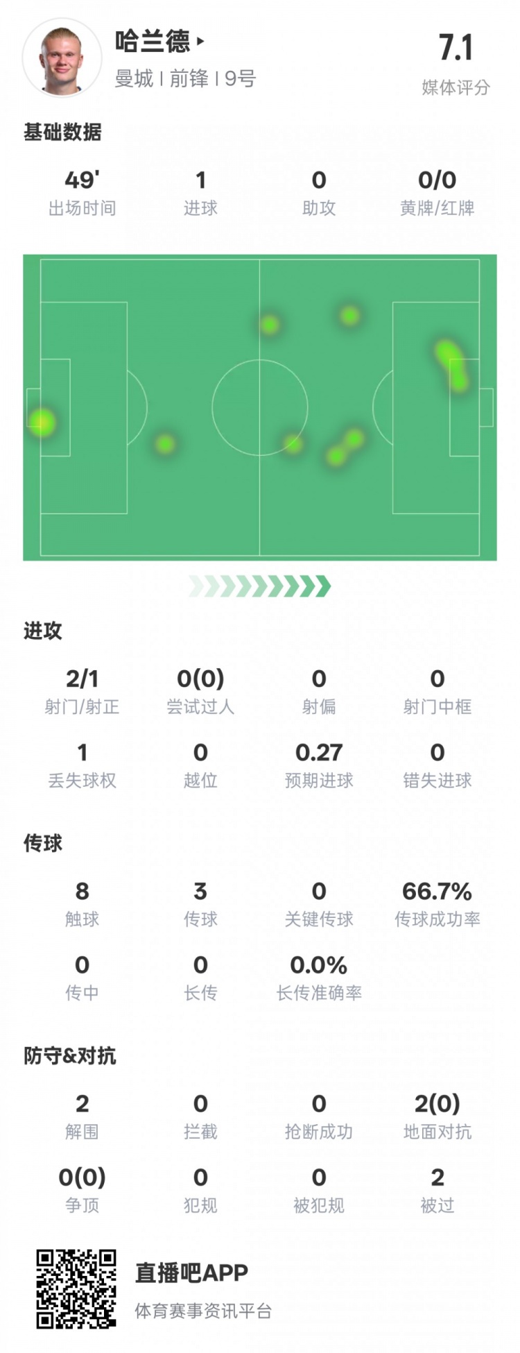 沒隱身!哈蘭德半場數(shù)據(jù):2射正1進(jìn)球2解圍,評分7.1