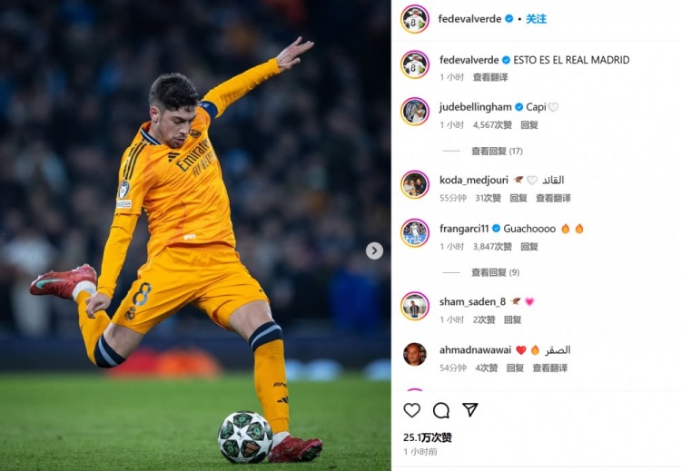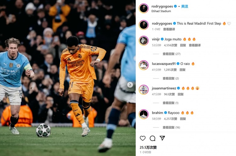 本場客串右后衛(wèi)的巴爾韋德表示:“這就是真正的皇馬!”而右邊鋒羅德里戈也配文道:“這就是皇馬!邁出(晉級)第一步????????”