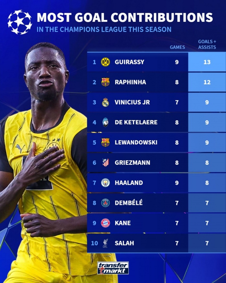 本賽季歐冠參與進(jìn)球榜:吉拉西13球居首,拉菲尼亞12球次席