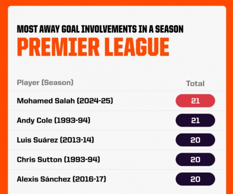 2月12日訊 Opta統(tǒng)計了球員單賽季在英超客場比賽中參與進(jìn)球的數(shù)量,并列出榜單,本賽季薩拉赫參與21球(13球8助),與科爾并列排名首位。
