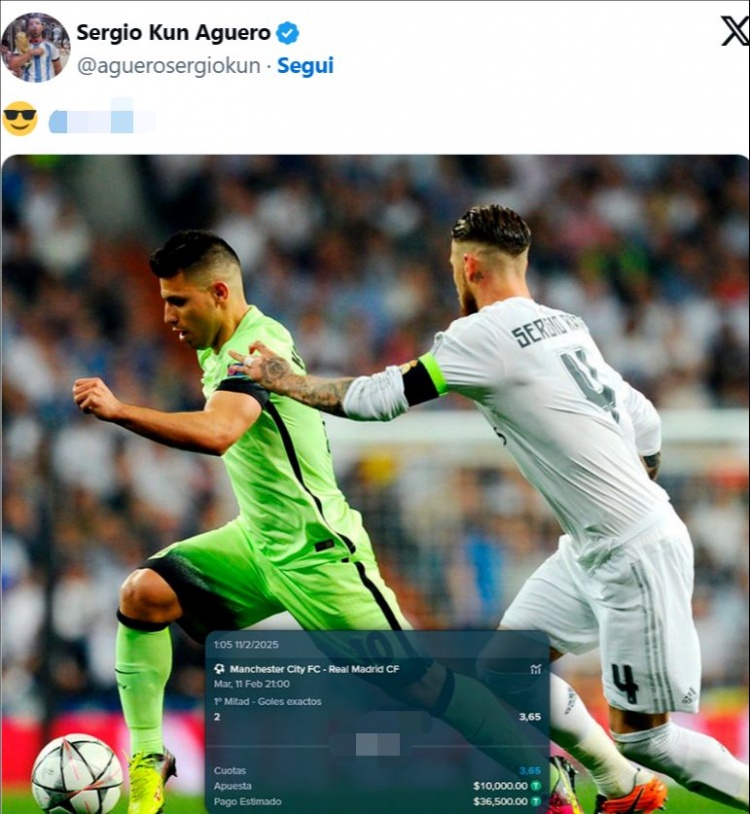 助興!阿圭羅下注曼城vs皇馬上半場2球,最終1-0結(jié)束輸?shù)?萬美金