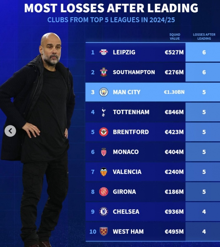 本賽季五大聯(lián)賽球隊被逆轉(zhuǎn)次數(shù)榜: