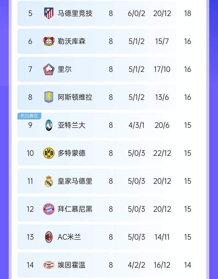 這賽季壓線晉級(jí)的這三支隊(duì)伍凈勝球分別是8/7/7球,他們?nèi)?duì)的戰(zhàn)績(jī)均是5勝1平2負(fù),這其中一場(chǎng)平局拿到的救命1分讓這三隊(duì)成功逃出生天。