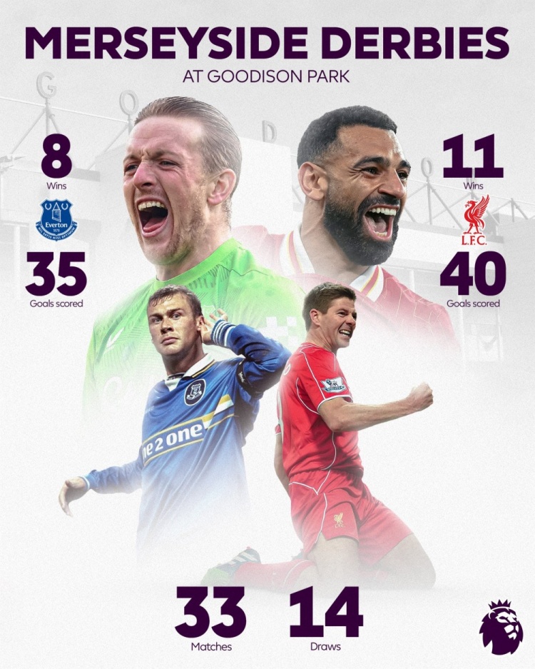 古迪遜公園進行33場英超默西塞德郡德比,利物浦11勝14平8負占優(yōu)