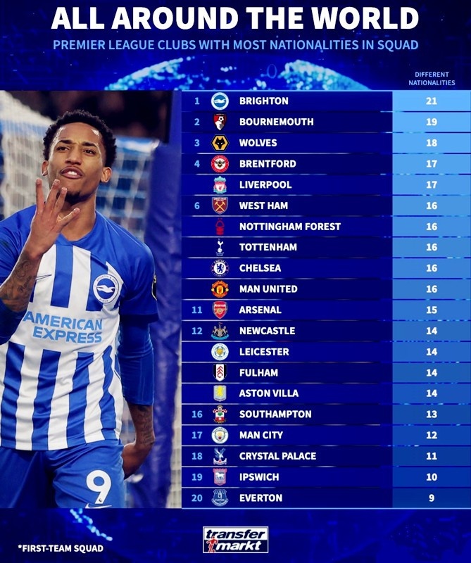上賽季,布萊頓一線隊(duì)的球員來(lái)自21個(gè)國(guó)家。