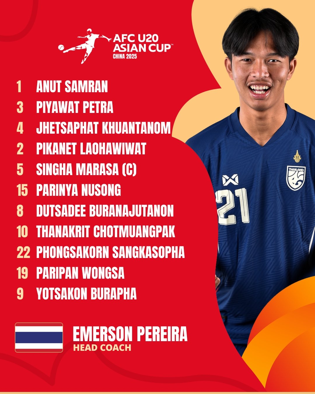 泰國U20首發(fā):1-阿努特、2-皮卡內特-勞哈維瓦、3-皮亞瓦、4-杰薩帕、5-辛哈、15-帕里尼亞、8-杜薩迪、10-塔納吉、19-巴里班、22-豐薩空、9-約沙功