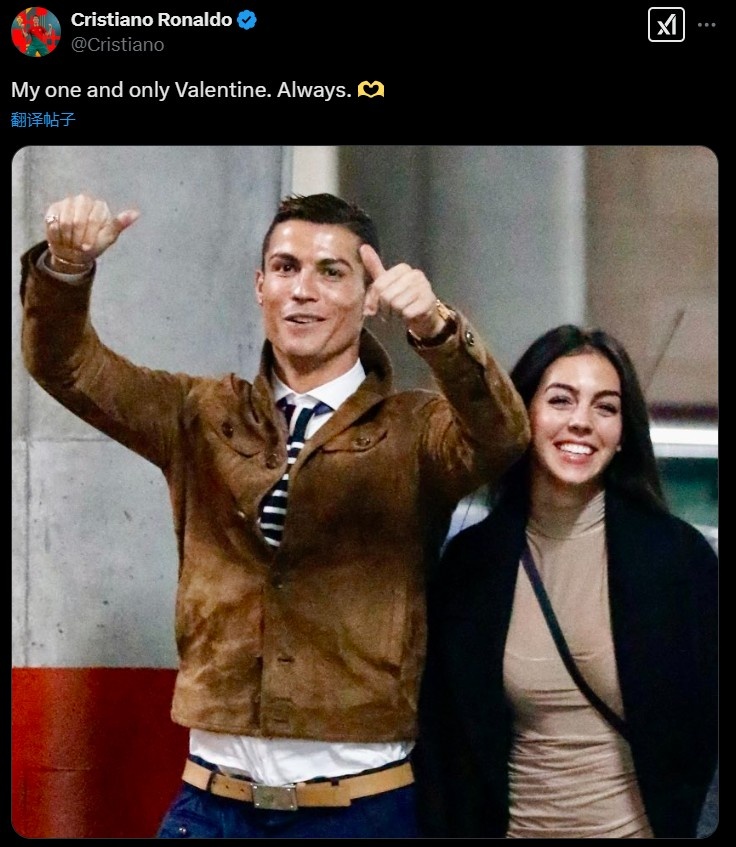 C羅在社媒上曬出了自己與喬治娜的合照,并配文道:我唯一的情人!永遠都是!